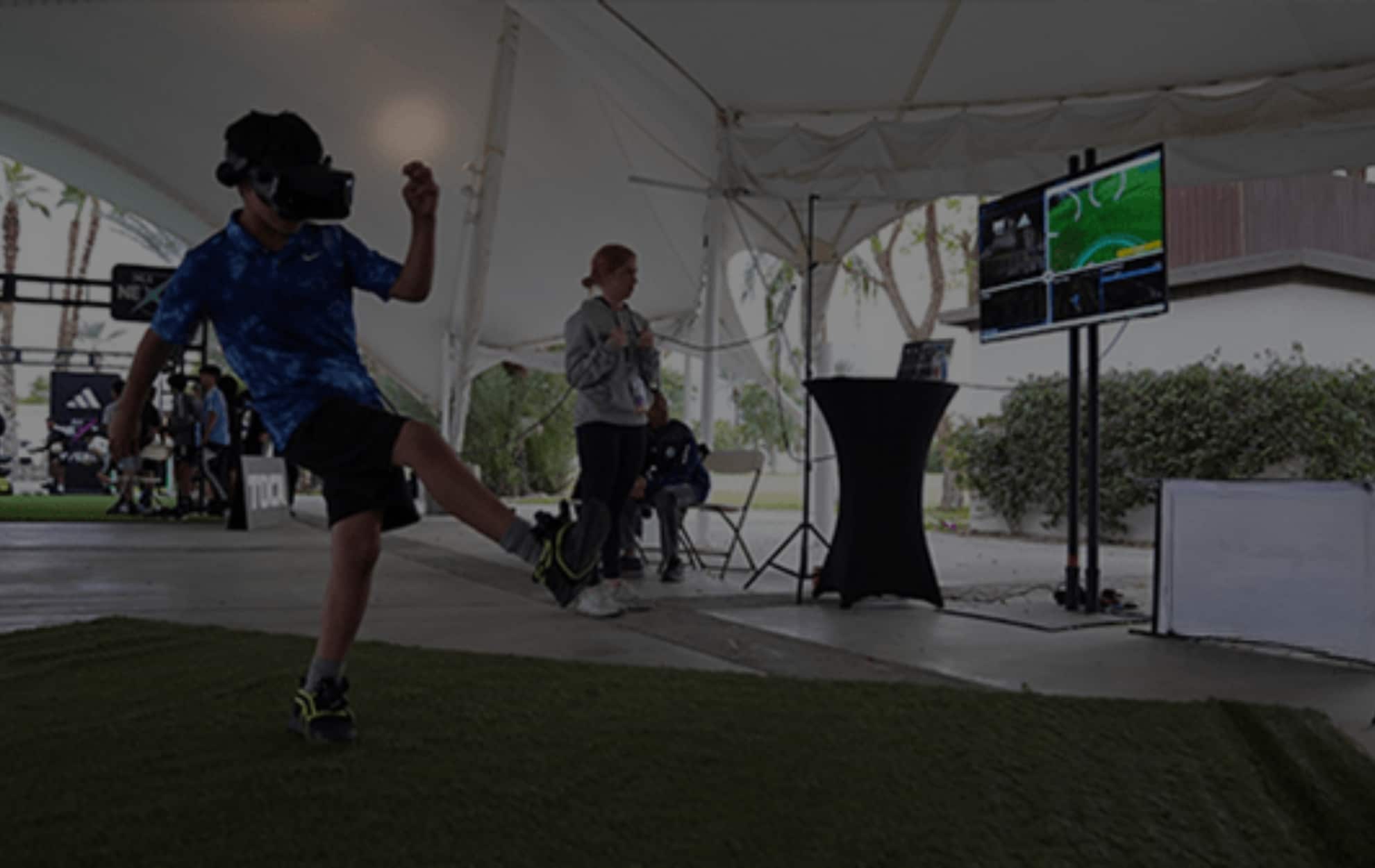 De simulator gebruikt een VR-bril en voettracking om je acties om te zetten in het spel. Je neemt plaats op het virtuele veld en probeert binnen 30, 60 of 90 seconden zoveel mogelijk doelpunten te scoren.